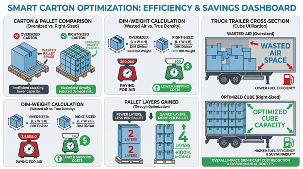 Trim box volume by 10 percent on a high-velocity item and you often gain a full extra layer on each pallet. Stretching across weekly lanes and a midsize shipper can eliminate multiple truckloads per quarter, turning ghost miles into hard savings and lower Scope 3 emissions.